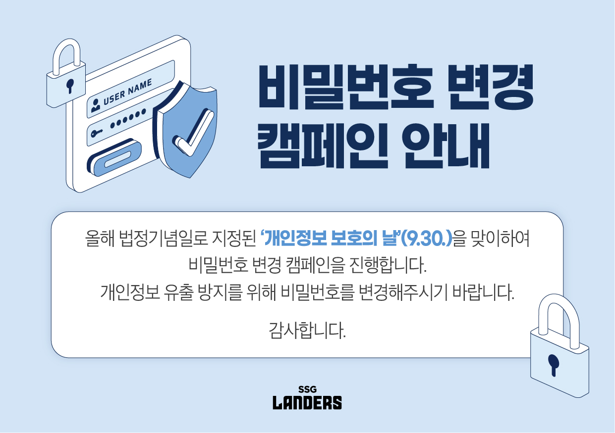 [공지] 비밀번호 변경 캠페인 안내 작성자 관리자 등록일자 2024년 1월 12일 17시 4분 41초 조회 1,587 안녕하세요.비밀번호 변경 캠페인 안내드립니다.2023년 법정기념일로 지정된 '개인정보 보호의 날'(9.30.)을 맞이하여 비밀번호 변경 캠페인을 진행하고 있습니다.개인정보 유출 방지를 위해 비밀번호를 변경해주시기 바랍니다.감사합니다. MHSTADIUM_POP_UP.jpg [ Size : 272.61KB , Down : 477 ] 미리보기 다운로드 목록보기